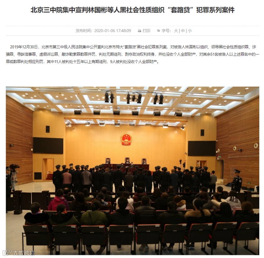 今年1月,北京市第三中级人民法院官网披露,2019年12月30日,北京市第三中级人民法院集中公开宣判北京市特大“套路贷”黑社会犯罪系列案,对被告人林国彬以组织、领导黑社会性质组织罪、诈骗罪、寻衅滋事罪、虚假诉讼罪、敲诈勒索罪数罪并罚,判处无期徒刑,剥夺政治权利终身,并处没收个人全部财产,对其余51名被告人以上述罪名中的一罪或数罪判处相应刑罚,其中11人被判处十五年以上有期徒刑,9人被判处没收个人全部财产。