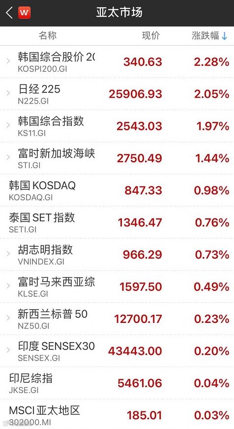 受此利好影响,亚太股市今日早盘普遍高开高走,截至发稿,日经225指数涨2.05%,再创1991年6月以来,近30年新高;韩国综合指数涨1.97%,也创2年半多来新高。泰国、印尼、新西兰等国的股市也纷纷走强。