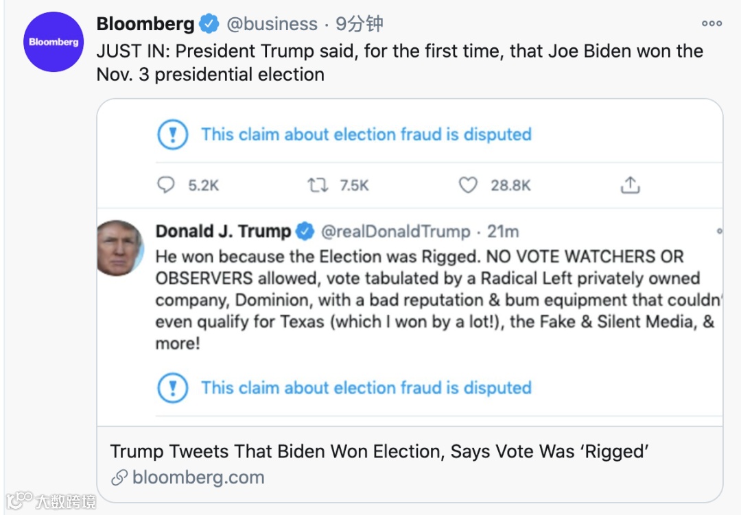 值得注意的是,彭博社随后在推特上发布消息称,这是特朗普首次说“拜登赢得11月3日总统选举”。