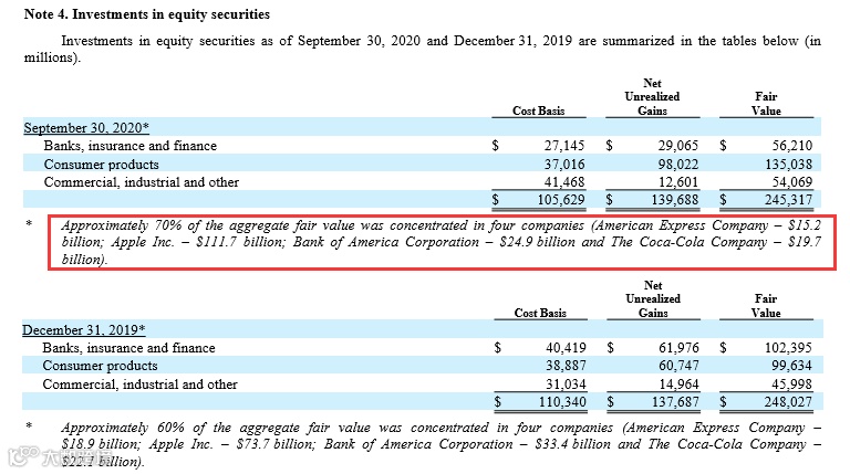 截至2020年9月30日,伯克希尔·哈撒韦大约70%股票持仓集中在四只股票:美国运通(持股152亿美元)、苹果(1117亿美元)、美国银行(249亿美元)、可口可乐(197亿美元)。对比去年年底前四大重仓股没有发生变化,但持股集中度明显提高。当时伯克希尔·哈撒韦大约60%的股票持仓集中在四只股票:美国运通(持股189亿美元)、苹果(937亿美元)、美国银行(334亿美元)、可口可乐(221亿美元)。