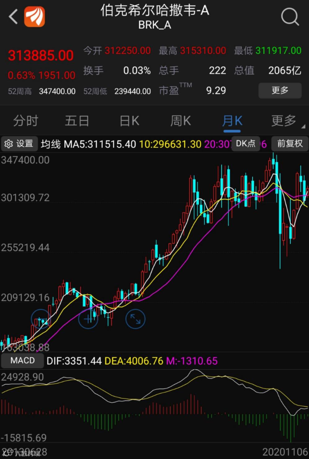 伯克希尔·哈撒韦A股和B股同时都有交易,今年2、3月期价股价一度遭遇大幅下跌,4月后企稳反弹,目前最新A股价格为313885美元/股,折后人民币超过200万元,今年累计涨幅为-7.57%。