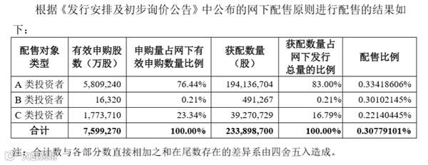 网下配售结果显示,A类投资者获配最多,获配1.94亿股,占蚂蚁网下发行总量的83%,配售比例为0.3342%。B类投资者获配49.13万股,占蚂蚁网下发行总量的0.21%,配售比例为0.3010%。C类投资者获配3927.07万股,占蚂蚁网下发行总量的16.79%,配售比例为0.2214%。