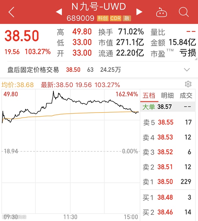 今日早盘,九号公司存托凭证一度涨逾160%,最终收涨103.27%,总市值271亿。全天成交额15.8亿,是科创板当天成交额排名第二的公司。