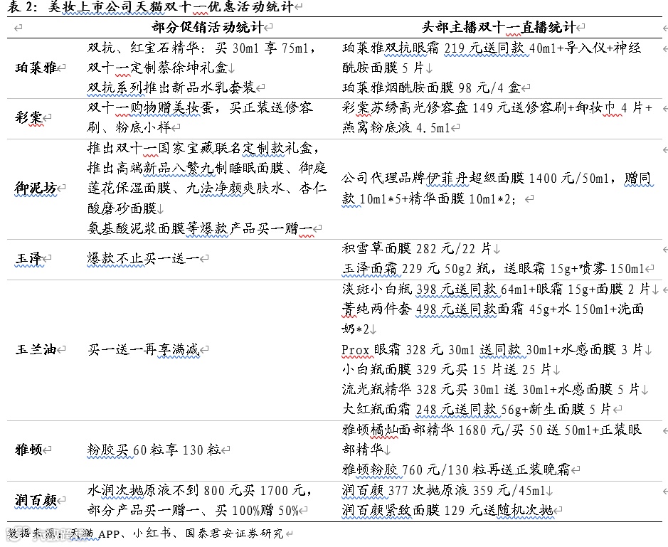 类似地,国泰君安零售团队也在研报中对天猫、京东、拼多多等平台的优惠政策进行详细梳理,并同样看好美妆行业,重点建议增持珀莱雅、御家汇、壹网壹创、青松股份、上海家化、丸美股份、若羽臣。其中,研报还对美妆上市公司天猫双十一优惠活动进行了详细统计。