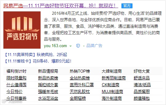 那么,网易严选是否真的会错过这个消费意愿爆棚的节日?官网信息显示,网易严选将双十一定义为“严选好物节”,同样在首页推出各种活动,包括“11.11省钱卡”、“11.11预售狂欢”、“定金购5折抢”等活动。