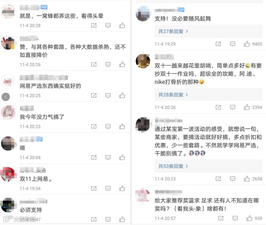 在评论中,有不少网友表示,是时候退出鼓吹过度消费的双十一了。“与其各种套路,各种大数据杀熟,还不如直接降价。”也有人称,“通过某宝第一波活动的感受,就想说一句,某些商家要搞活动就好好搞,多点折扣和优惠,少一些套路。”