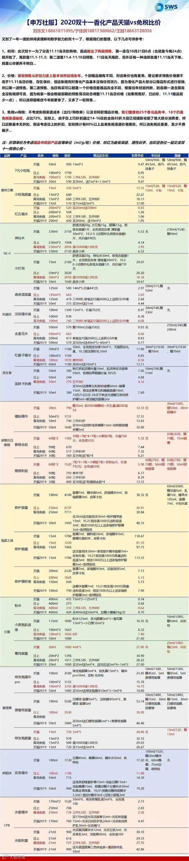 就在2019年的预售活动开启之前,申万宏源研究的两名分析师曾推出一份《2019双十一化妆品看这一张图就够》的图表,一时间刷爆全网,为不少迷茫的“剁手族”指明了方向。类似地,近期申万宏源社服团队再次推出香化产品的详细打折表,贴心地列出雅诗兰黛、SK-II、科颜氏等品牌的明星产品的最佳购买渠道,“剁手族”可按图索骥。