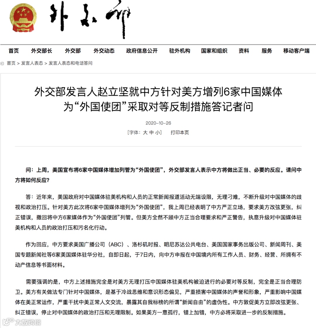 据外交部官网10月26日晚消息,有记者问:上周,美国宣布将6家中国媒体增加列管为“外国使团”,外交部发言人表示中方将做出正当、必要的反应。请问中方将如何反应?