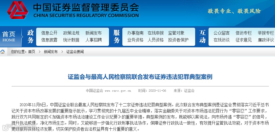 11月6日,最高检和证监会经过认真筛选、充分沟通,各自挑选出了6个刑事犯罪案例和6个行政违法案例作为典型案例予以发布。