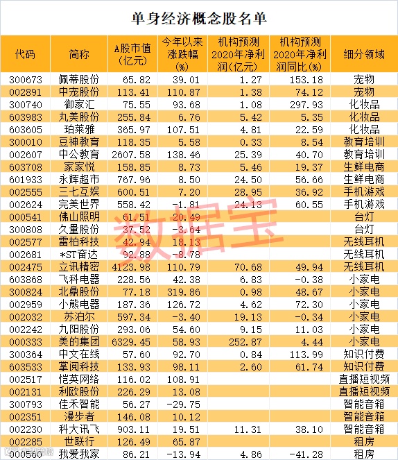 股价表现方面,单身经济概念股北鼎股份、中公教育、小熊电器、中宠股份、立讯精密、恺英网络、珀莱雅等7家公司年内股价涨幅均在100%以上。
