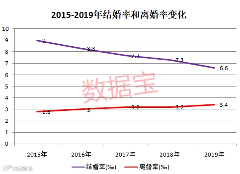当代年轻人的婚姻观也在发生变化,晚婚、恐婚现象悄然形成。据民政部发布的数据显示,2019年,全年依法办理结婚登记 927.3万对,比上年下降 8.5%;依法办理离婚手续470.1万对,比上年增长5.4%。结婚率2019年降至6.6‰,离婚率则上升至3.4‰。
