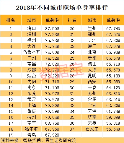 民生证券早前发布的研报显示,去年智联招聘联合珍爱网发布《2018 年职场人婚恋观调研报告》,参与调研的职场人里面,68.33%处于单身状态。在全国主要城市中,海口的单身率最高,87.5%职场人是单身。四大一线城市中,深圳职场单身率最高,达到77.23%,广州、上海、北京依次排在其后。
