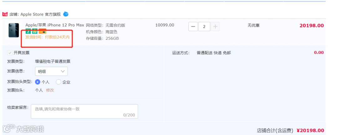 苹果天猫旗舰店及苹果官网对新机均进行了限购,每款机型人均限购两部。目前,iPhone 12 Pro MAX仍可下单,但发货时间为付款后24天内。