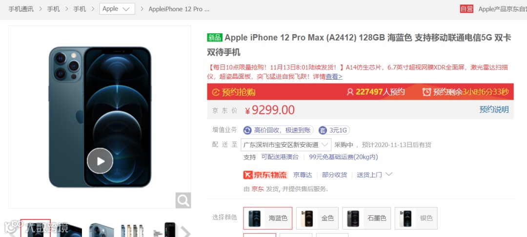 截至发稿,苹果京东自营店首批货已经全部售罄,而下一批iPhone12 Pro Max的预约人数已经突破22.7万。