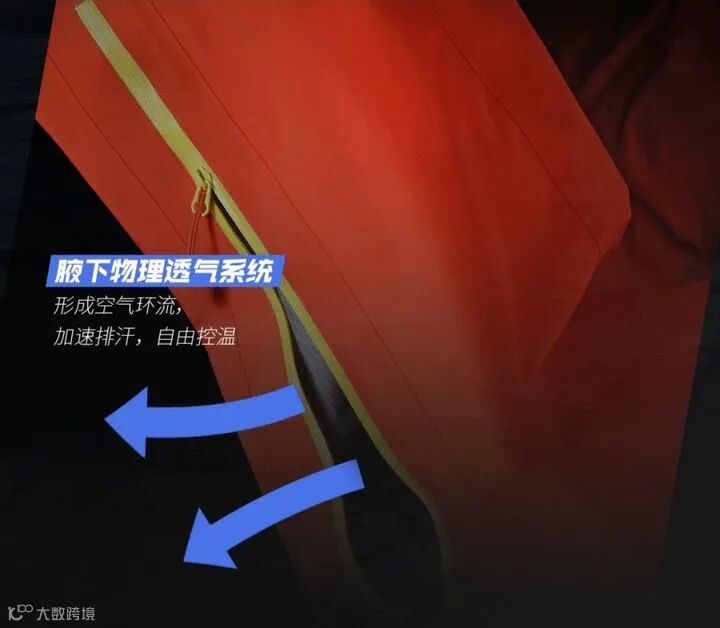 从透气系统看,有≥38cm的腋下双向透气拉链,可以形成空气环流,加速排汗,自由控温。