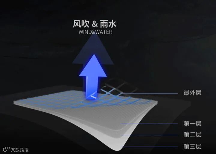 冲锋衣的面料应该具备三大功能:防风、防水、透气。