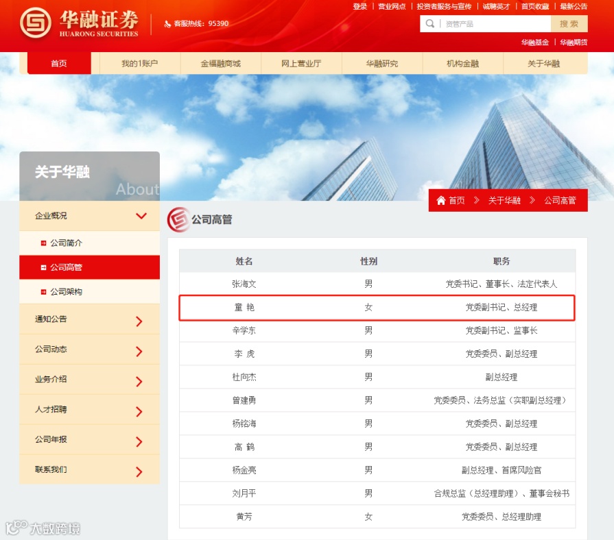 近期,华融证券低调更新官网高管信息,“党委副书记、总经理”一职已更新为童艳。在此之前,8月27日,华融证券曾于债券市场发布公司总经理变更的公告,董事长张海文不再代为履行华融证券总经理职责。