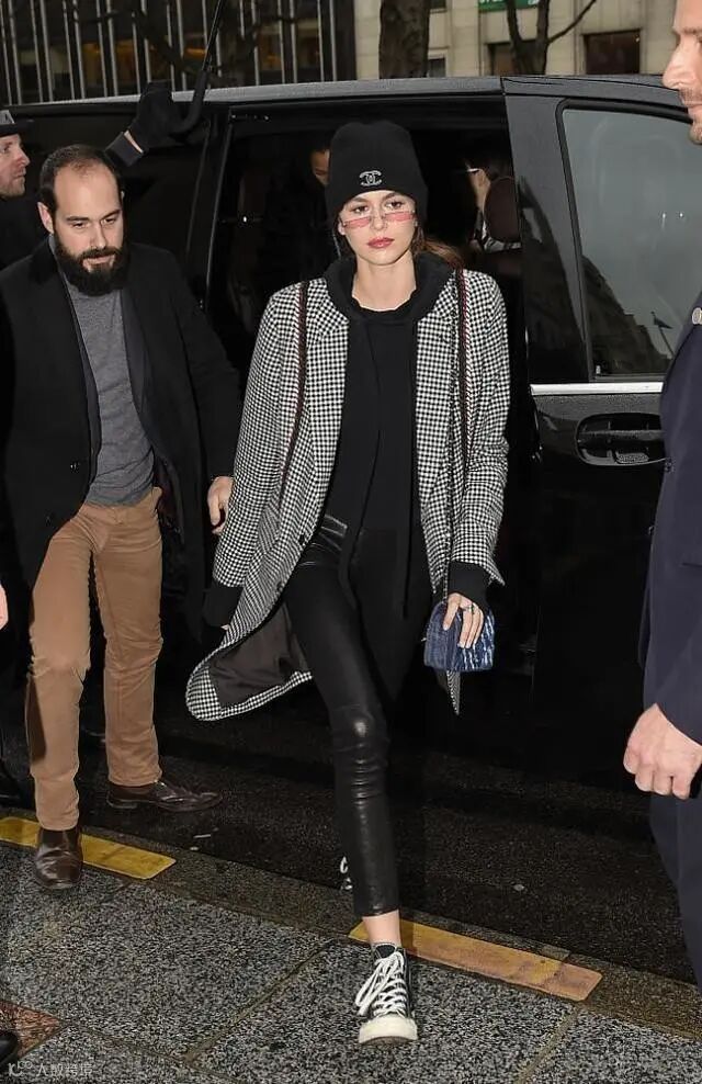 千鸟格西装可以和黑色卫衣进行搭配,这样的话,既有着千鸟格西装的复古优雅,又有着黑色卫衣的稳重低调,整理的造型就非常的有气质了。