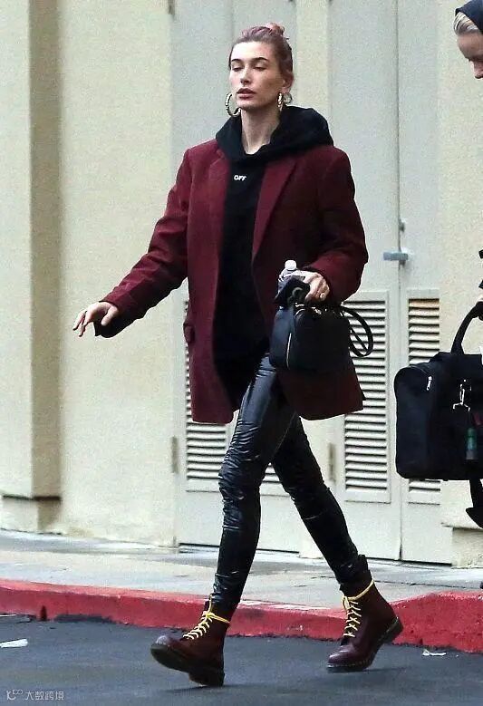 为了让造型更加复古和成熟,可以利用酒红色西装去搭配黑色卫衣,映山红的造型就能够轻松地打造出复古高级的气质了,再搭配一条黑色皮裤,还能够展现摩登感。