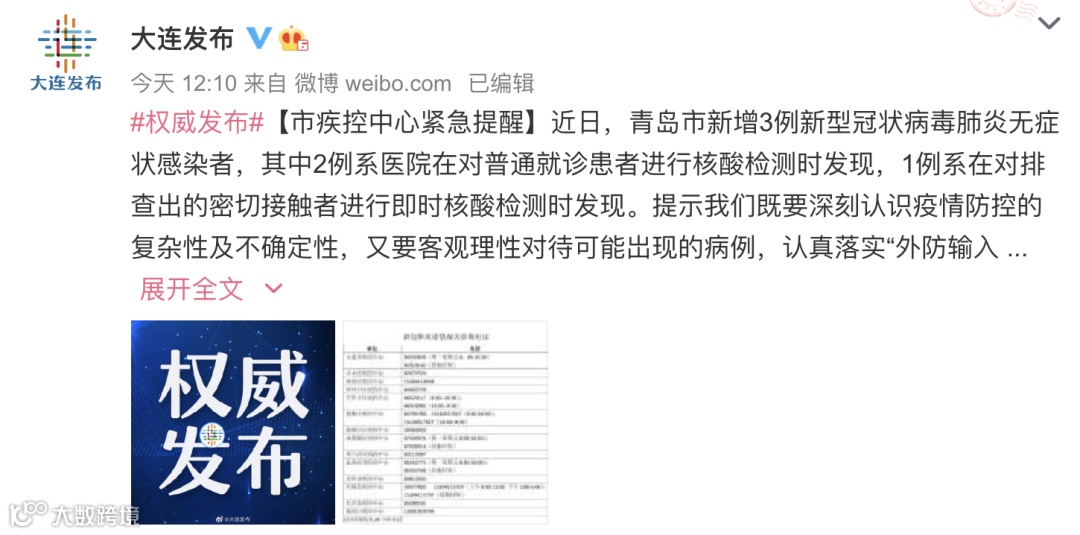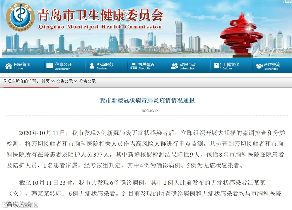 此前,青岛市卫健委在10月11日发布通报称,青岛市新增3例新型冠状病毒肺炎无症状感染者。
