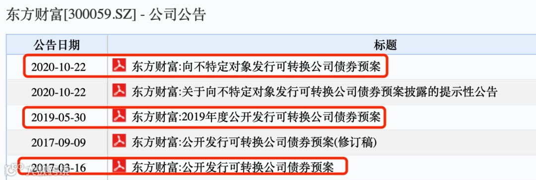 回溯东方财富上市以来的再融资历程,发现其对于可转债的偏爱一如既往——从2017年3月至今,不到4年的时间里,东方财富已发布了三份可转债发行预案。