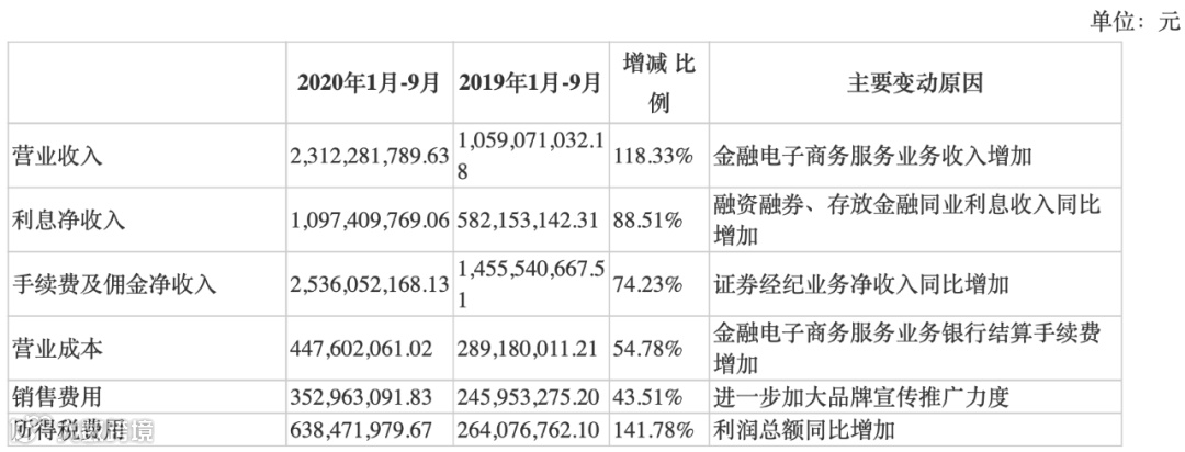数据显示,今年前三季度,得益于融资融券、存放金融同业利息收入同比增加,东方财富共实现利息净收入10.97亿元,同比增加88.51%;因证券经纪业务净收入同比增加,实现手续费及佣金净收入25.36亿元,同比增加74.23%。