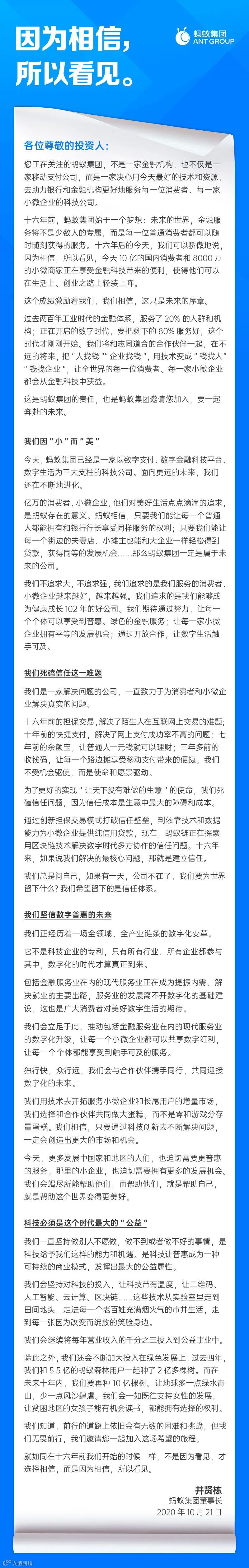 10月21日晚间,蚂蚁集团更新招股书后,董事长井贤栋致发出投资者的公开信。