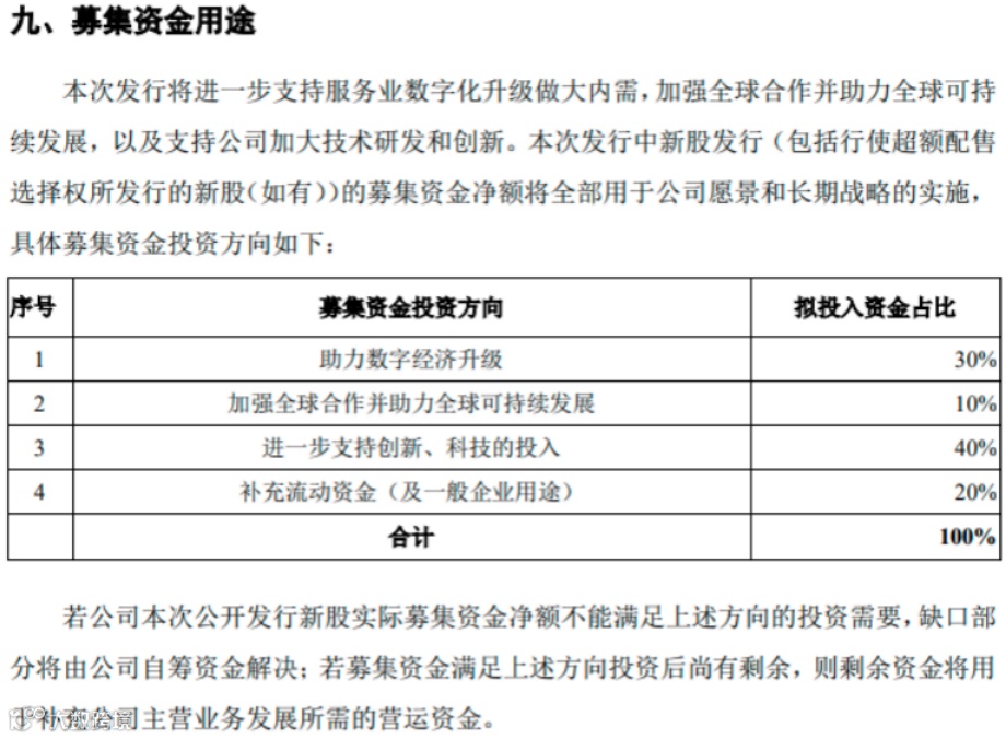 蚂蚁集团强调其科技基因属性。招股意向书显示,蚂蚁集团募集资金投资四大方向,包括助力数字经济升级(占比30%)、加强全球合作并助力全球可持续发展(占比10%)、进一步支持创新、科技的投入(占比40%)、补充流动资金(占比20%)。