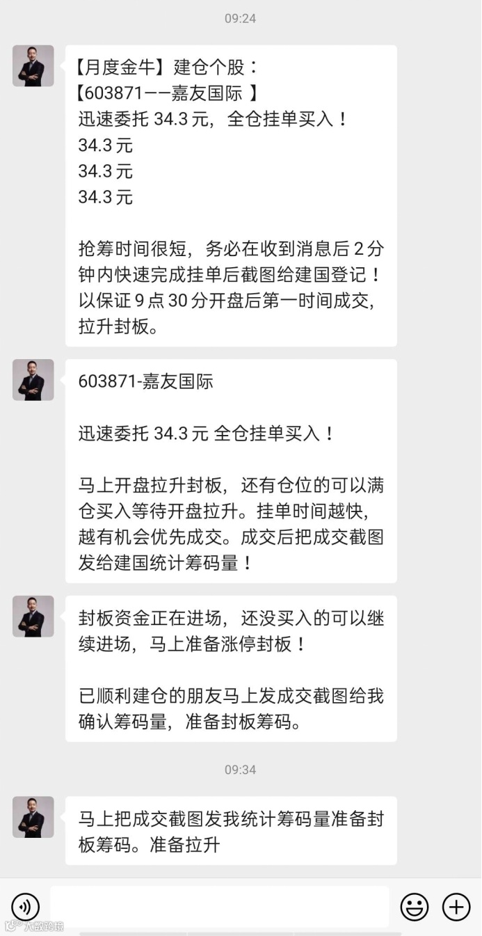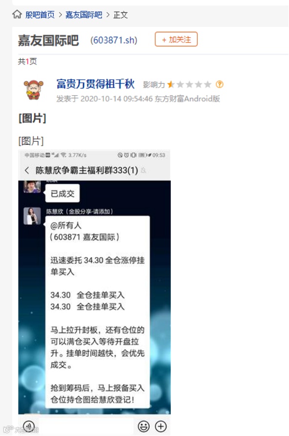 有网友贴出的微信截图显示,在一个名为“陈慧欣争霸主福利群”中,有人叫群中所有人“迅速委托”、“34.30 全仓挂单买入”,并称“抢到筹码后,马上报备买入仓位持仓图给慧欣登记!”