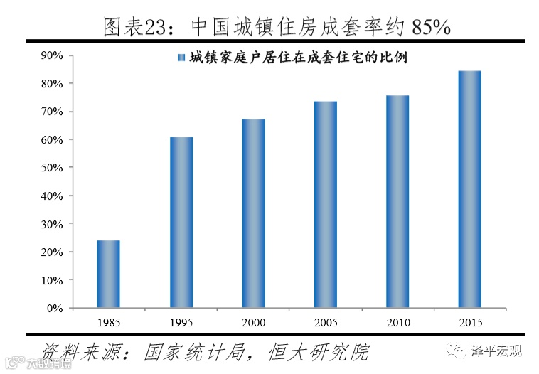 三是中国现有城镇住房成套率仅85%,并且尚有20%的家庭居住在条件较差的平房,存在住房更新需求。一是中国城镇住房成套率仅85%左右,还有约15%的住宅需要更新。1985年中国城镇住房成套率仅为24.1%,1995年居住在成套住宅的家庭户比例快速提升至61%,2010年、2015年分别达75.6%、84.3%。其中,根据2015年小普查数据,城市、镇家庭户中同时拥有厨房和厕所的比例分别为89.3%、76.8%。二是中国城镇尚有约20%的平房需要更新。随着拆迁新建,中国城镇家庭户中居住在平房比例从1995年的46.1%降至2015年的20.6%,其中城市、建制镇分别为10.2%、36.1%。