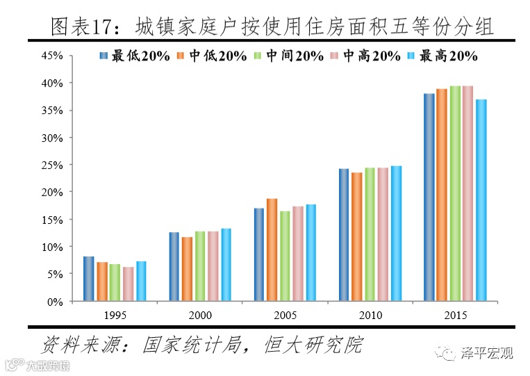 根据人口普查资料城镇家庭户住房“使用”情况的数据估算,1995-2015年全国城镇家庭户住房使用分布的基尼系数大致保持在0.3左右,这显然存在低估。如果考虑20%的城镇家庭户租房、人均住房面积更低的城镇集体户人口以及2亿多农民工群体在城镇置业比例较低等情况,低收入群体实际拥有的住房面积占比与其户数即人口占比的比例无疑将更低,即产权层面的城镇家庭住房分布基尼系数无疑更高。
