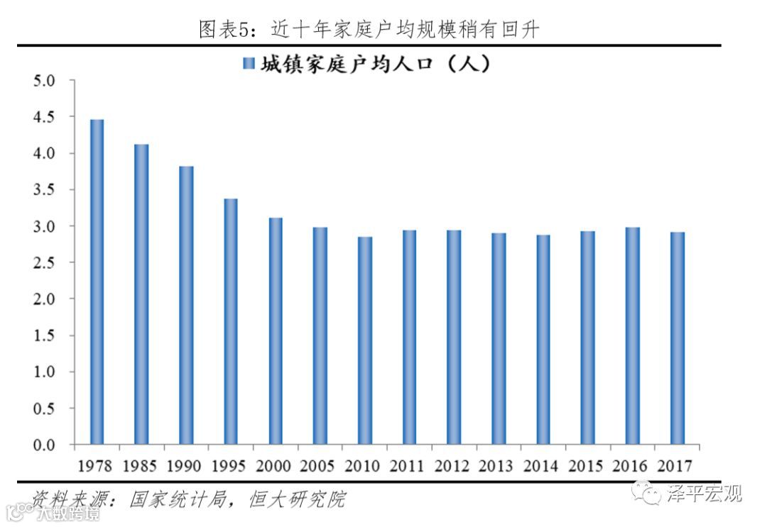 三是城镇家庭户均规模数据依据人口普查、“小普查”、及年度人口变动抽样调查。从国际经验看,家庭户均规模具有小型化趋势。由于劳动力回流中西部、生育政策有所放开等因素,近十年家庭户均规模稍有回升。比如,2015年“小普查”统计城镇家庭户均规模为2.93人,高于2010年的2.85人。从人口变动抽样调查看,2016、2017年的城镇家庭户均规模分别为2.98、2.92。因此本文根据趋势,假定2018年城镇家庭户均规模为2.90。