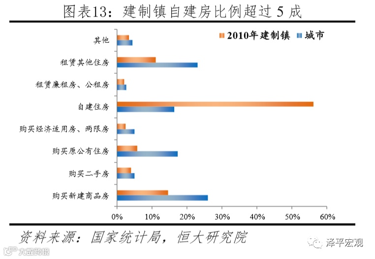 在城镇内部,城市和建制镇家庭户的住房来源结构存在显著差异。根据2010年人口普查,城市家庭户住房来自购买新建商品房、原公房的比例分别为26%、17.3%,明显高于建制镇的14.7%、5.8%;而建制镇家庭户住房来自自建房的比例高达56.2%,明显高于城市的16.4%。
