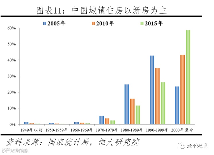 随着1990年代住房制度改革推进,特别是1998年国务院下发《关于进一步深化城镇住房制度改革加快住房建设的通知》后,商品住宅带动城镇住宅竣工面积大幅攀升。按照国家统计局的口径估算,1978年全国城镇竣工住宅面积不足1亿平,1998年超过5亿平,2011年超过10亿平;其中,竣工商品住宅面积占城镇竣工住宅面积占比从1995-1999年的不足32%,跃升至2000年的38%,2003年超过60%,2007年超过70%;从全国人口普查和小普查资料的房龄结构数据看,有约97%的城镇住房为1978年以来建造,约87%为1990年以来建造,约60%的城镇住房为2000年以来建造。与中国不同,欧美发达经济体的住房平均房龄较老,比如英国、美国住房房龄超过50年的比例均超过40%,超过100年房龄的比例分别为20%、7%。