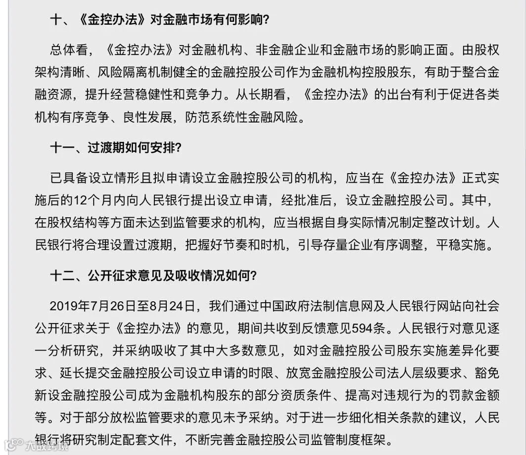 实际上,早在去年7月底,央行就发布过《金融控股公司监督管理试行办法(征求意见稿)》,并开展为期近一个月的公开征求意见。据了解,征求意见期间,央行共收到反馈意见594条,并采纳吸收了其中大多数意见,如对金融控股公司股东实施差异化要求、延长提交金融控股公司设立申请的时限、放宽金融控股公司法人层级要求、豁免新设金融控股公司成为金融机构股东的部分资质条件、提高对违规行为的罚款金额等。