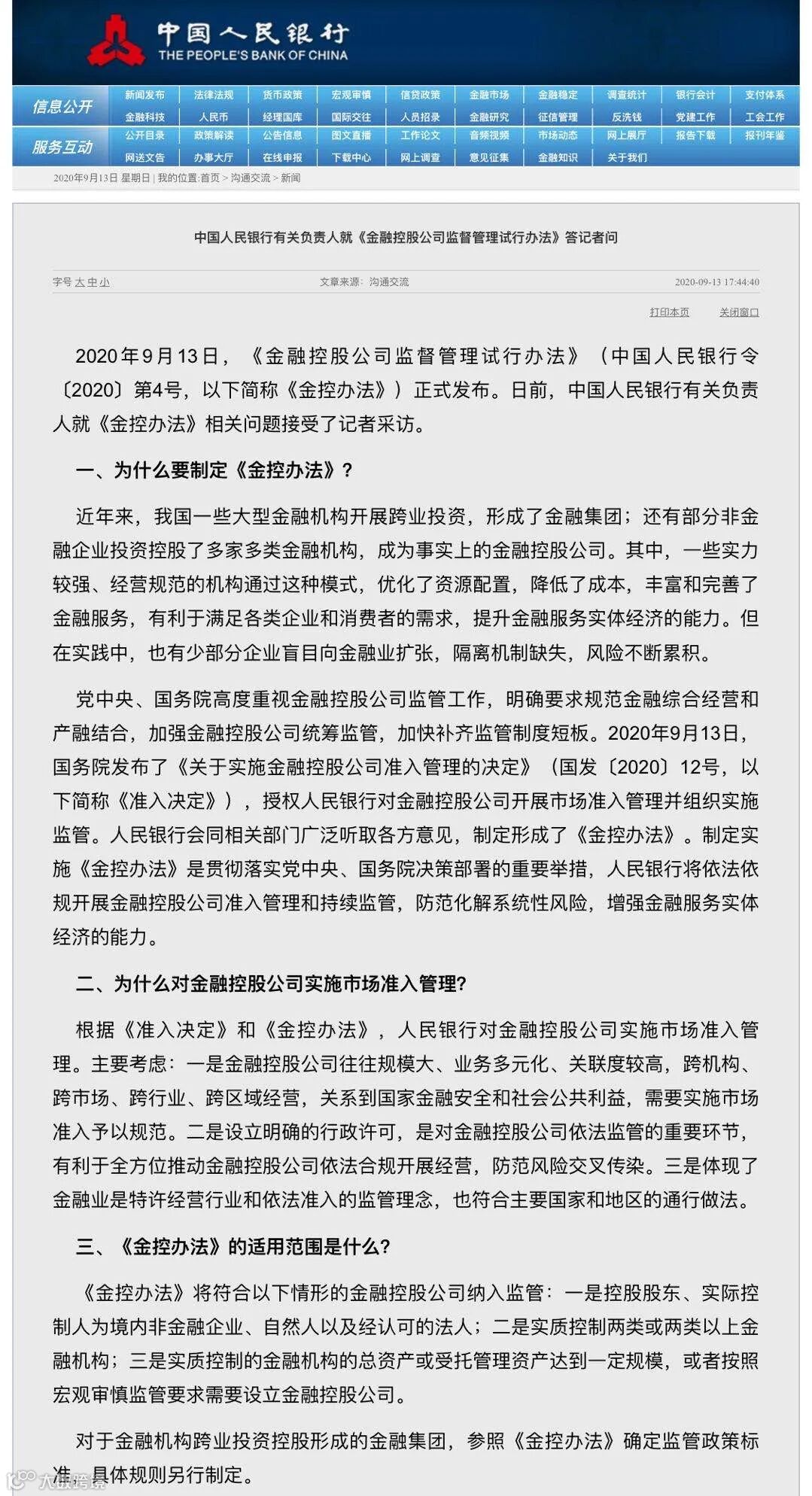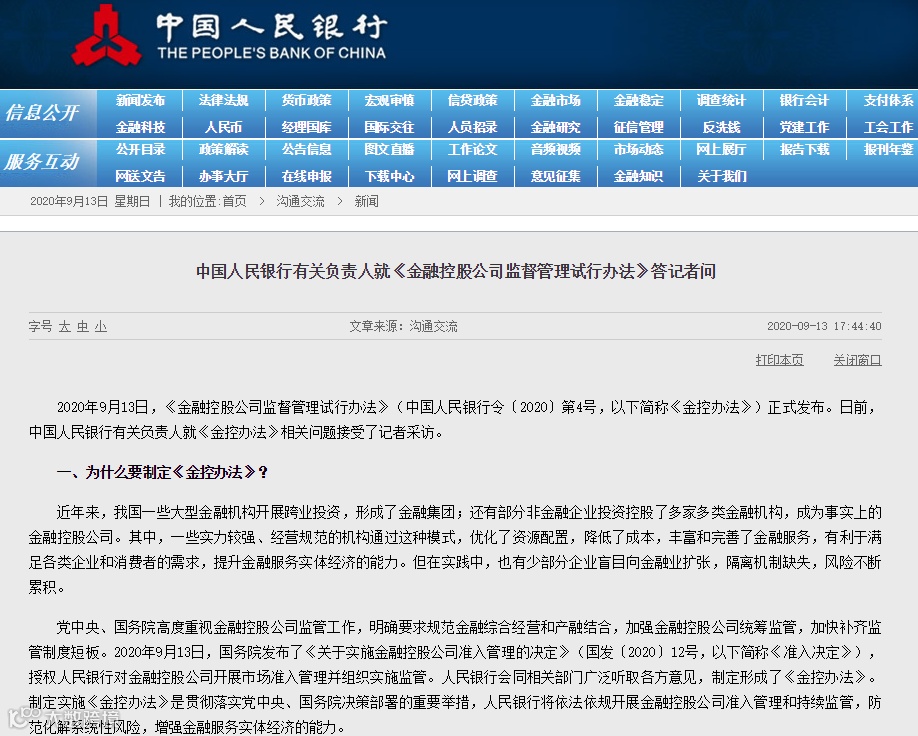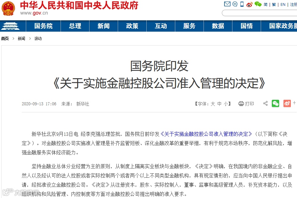 9月13日,国务院发布《关于实施金融控股公司准入管理的决定》(以下简称《准入决定》),授权央行对金融控股公司开展市场准入管理并组织实施监管。同日,央行正式对外发布《金融控股公司监督管理试行办法》(下称《金控办法》),并自2020年11月1日起施行。