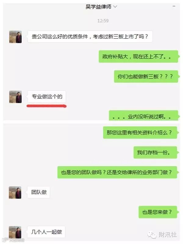 另据新浪、搜狐等门户网站转载文章称,虽然举报神州专车的吴学益律师各项公开资料,甚至其微信、微博等社交账号都毫无与新三板相关的业务及关注痕迹,但某企业人士与吴律师的微信对话却透露出,吴学益律师其实是“团队专业做新三板业务”的事实。并附交谈截图为证。