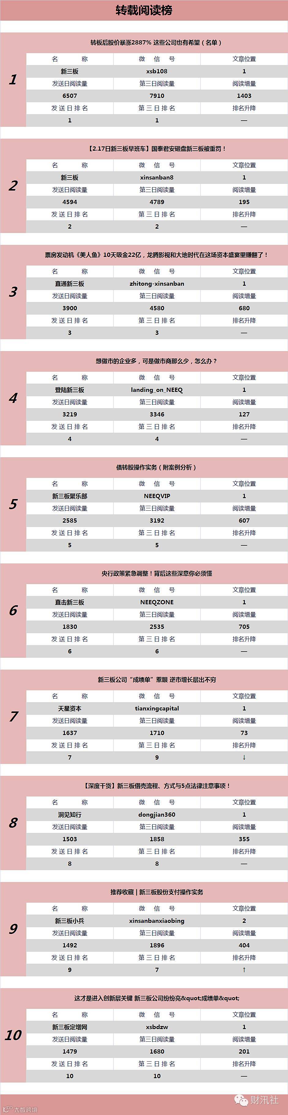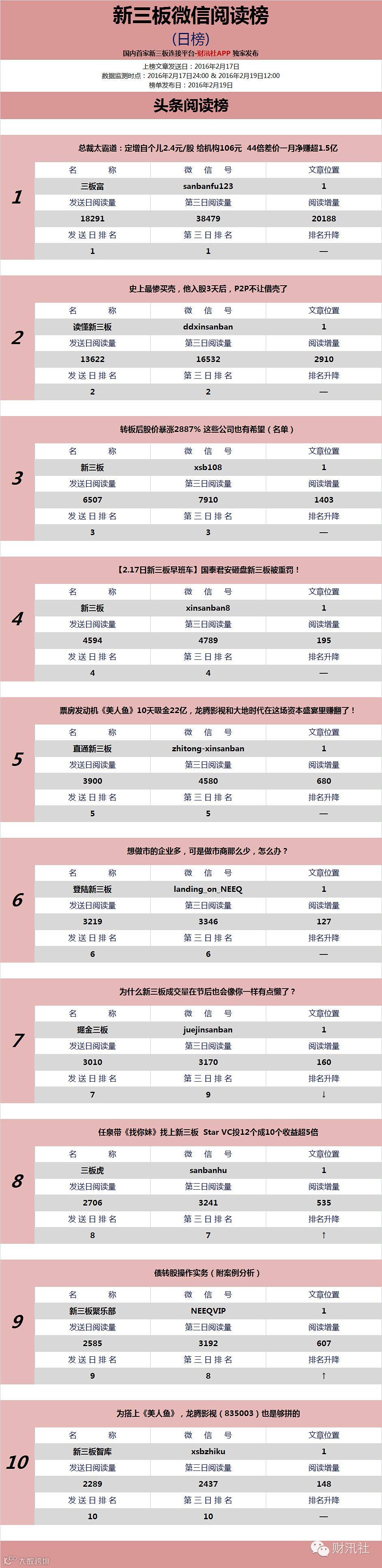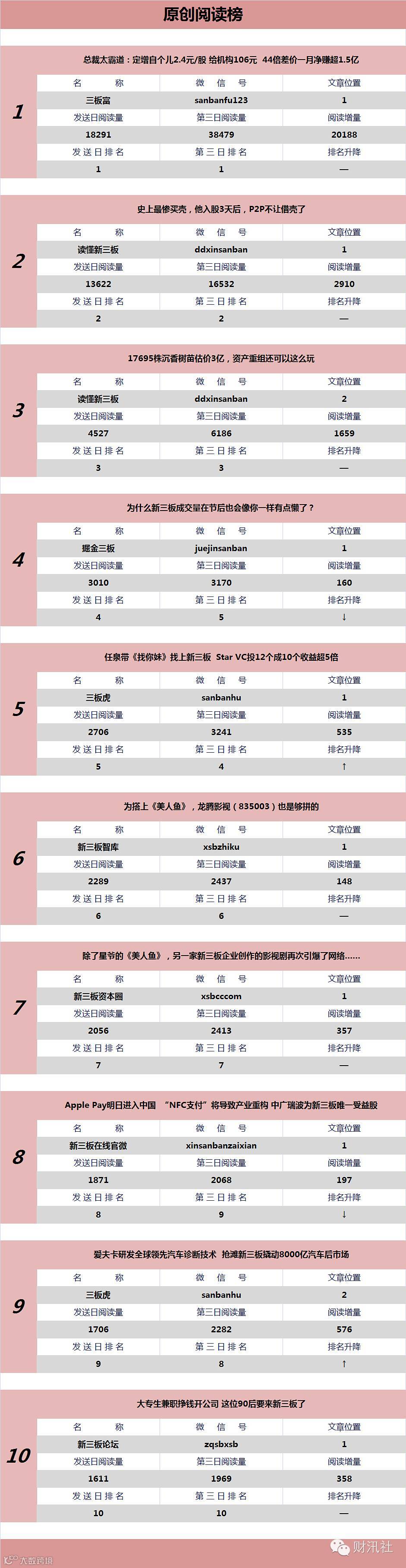 《新三板微信阅读榜(日榜)》今日发布第32期。由【财汛社APP】官方订阅号@财汛社(微信号:caixunshe)首发。