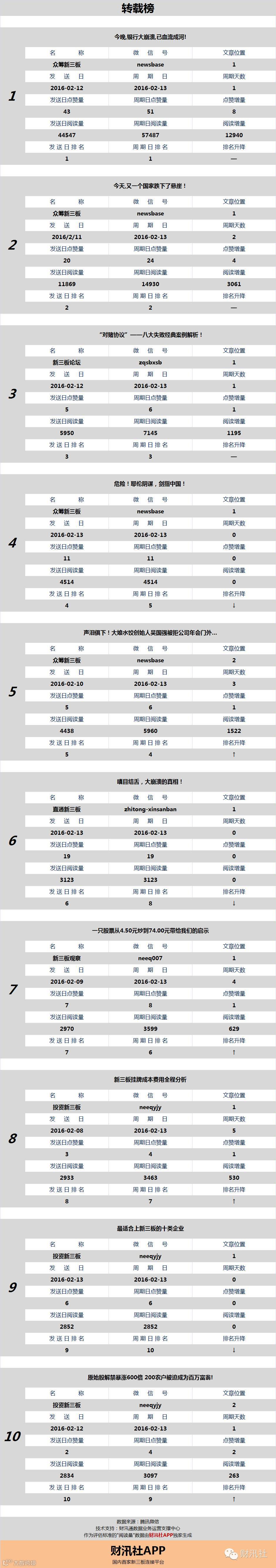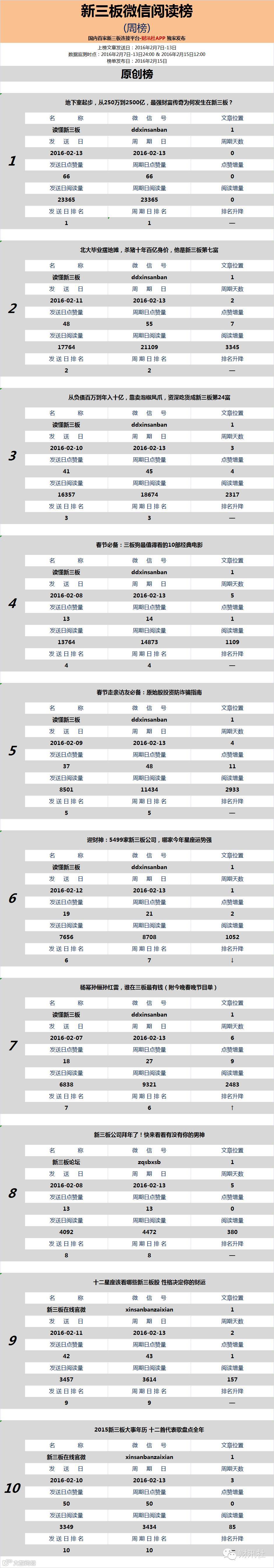 今日发布的《新三板微信阅读榜》(周榜)文章为上榜公众号于2016年2月7日-13日发送。