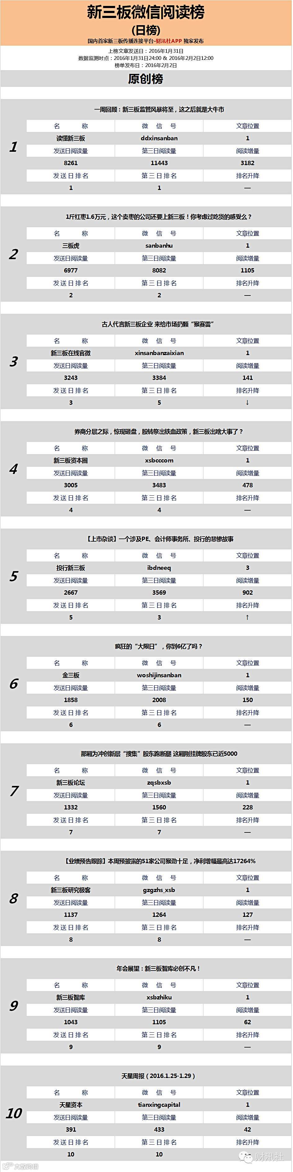 今日《新三板微信阅读榜》文章为上榜公众号于2016年1月31日发送。社掌给财迷们归纳文章重要信息:
