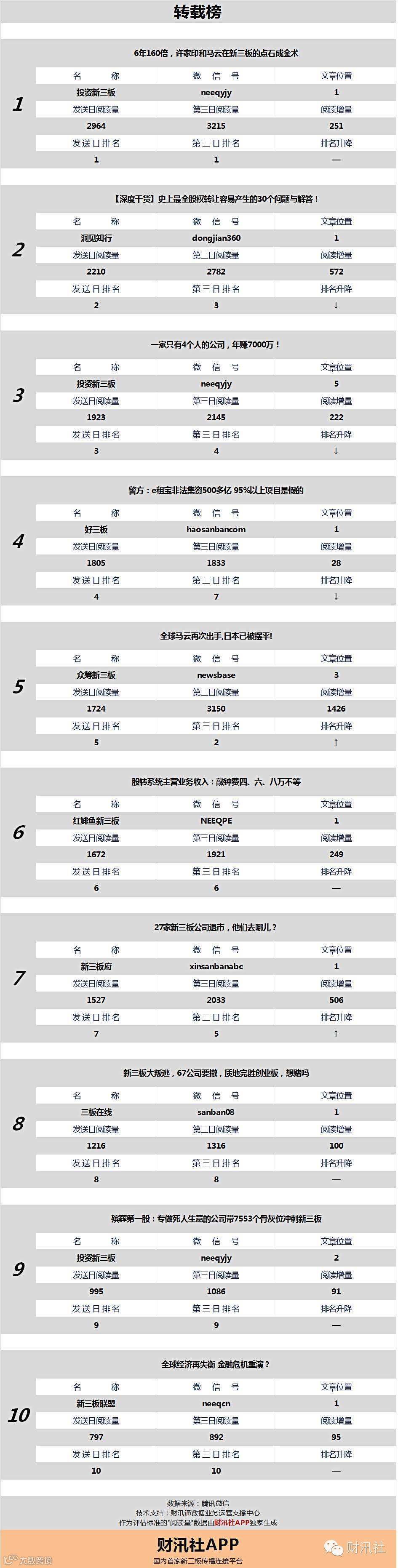 一日定座次,三日分高下。由【财汛社APP】官方订阅号@财汛社(微信号:caixunshe)独家发布的《新三板微信阅读榜》(日榜)以文章发送日的阅读量作为排名依据,而以第三天中午的阅读量数据作为文章可读性和话题性的孰优孰劣之参考,同时也体现公众号用户的活跃度和粘性。