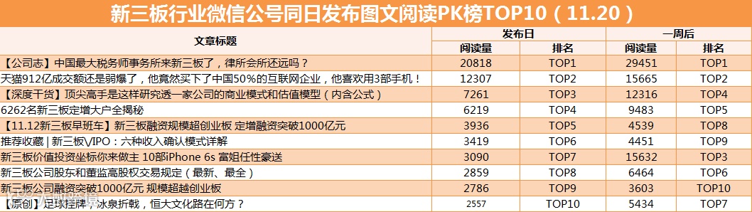 国内首家专业的新三板数字化投融传播平台——财汛社的运营团队(人称“社掌”),于2015年11月20日起推出独家特色产品——新三板行业微信公号同日发布图文阅读PK榜TOP10。