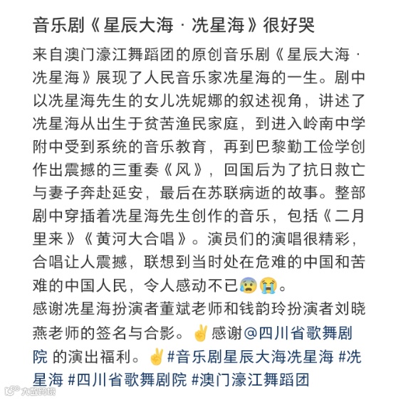 “泪崩”、“震撼”、“感人”……这些是《星辰大海·冼星海》演出结束后,收获的高频词汇。