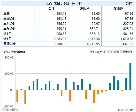 外资尤其猛。据Wind数据显示,北向资金全天大幅净买入163.16亿元,创年内次高,历史净流入额排名第八;其中沪股通净买入65.59亿元,深股通净买入97.56亿元。近两个交易日,外资加速流入,两天净买A股达234亿元。