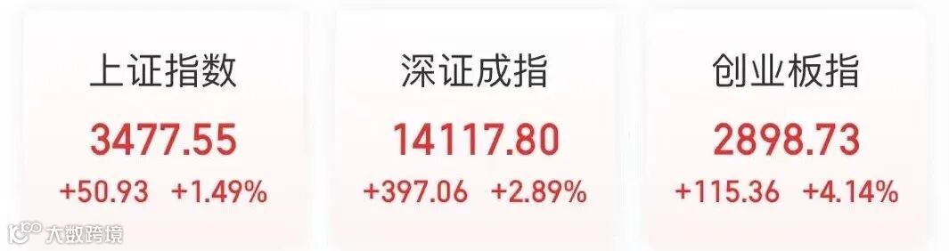 上证指数收盘涨1.49%,报3477.55点;深证成指涨2.89%,报14117.8点;创业板指涨4.14%,报2898.73点,创逾14个月最大单日升幅。A股总市值单日暴增1.5万亿。