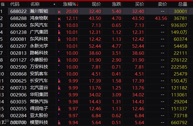 无人驾驶题材的火爆也引爆了新能源汽车。北汽蓝谷、安凯客车、广汽集团、长安汽车、东风汽车、东风科技、长鹰信质、小康股份、渤海汽车等逾20股涨停。