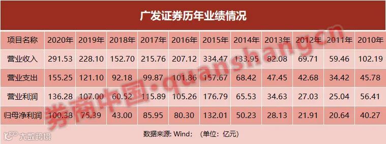 根据Wind数据,广发证券2010年借壳延边公路上市以来,净利润突破百亿大关的时候仅有2015年大牛市时期,当年净利润达到132亿元,2020年再次突破百亿达到100.38亿元,同比增长逾三成。