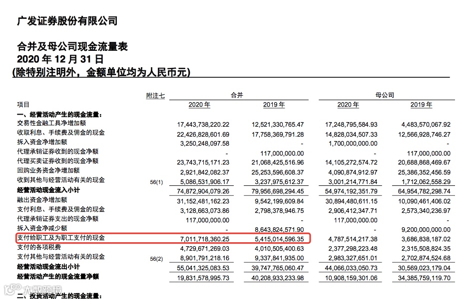 以合并报表口径计算,广发证券去年支付给职工薪酬70.11亿元,同比增加29.47%,人均薪酬约56.96万元;而若以母公司口径计算,支付职工薪酬总额为47.87亿元,同比增加29.87%,人均薪酬约46.12万元。