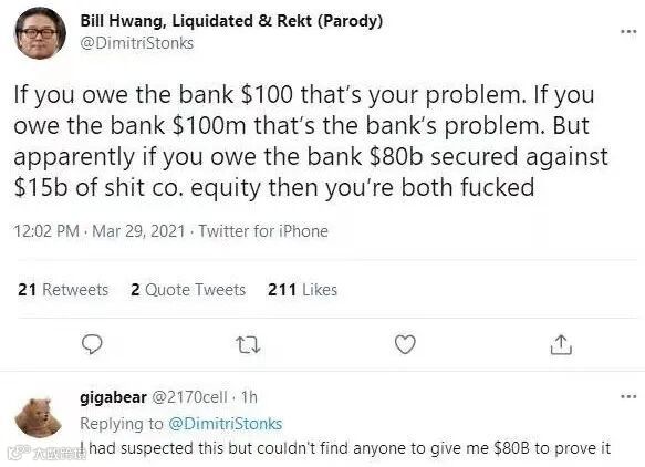 国际大行出事,跟上周五对冲基金爆仓存在较大关联。该对冲基金经理Bill Hwang在其推特最新发声称,如果你欠银行100美元,那是你的问题。如果你欠银行1亿美元,那就是银行的问题。但很明显,如果你欠银行800亿美元担保150亿美元的股票,那么你们俩就完蛋了。