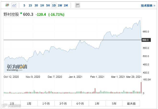 野村于3月29日发布公告,在3月26日(上周五),野村的美国子公司可能会因为一名美国客户的交易而出现重大亏损。按照3月26日的市场价格,野村估计损失金额约为20亿美元。29日亚洲股市开盘后,野村股价大跌近17%。